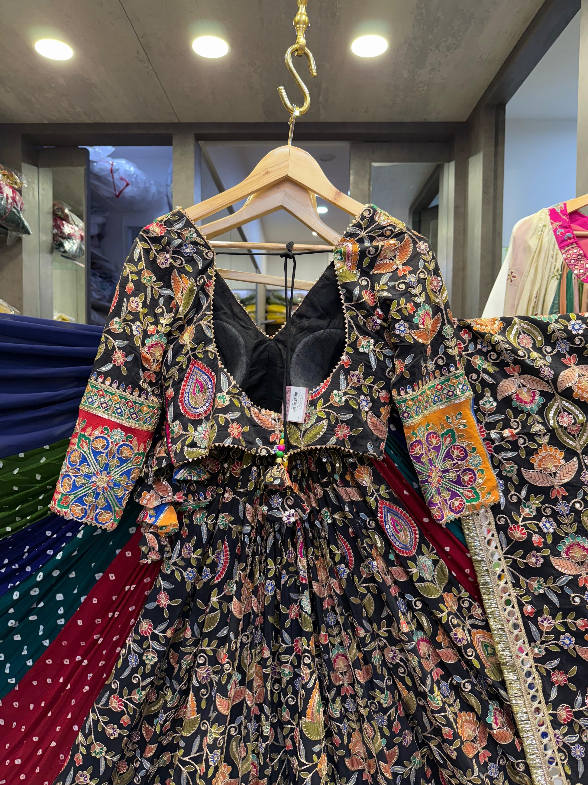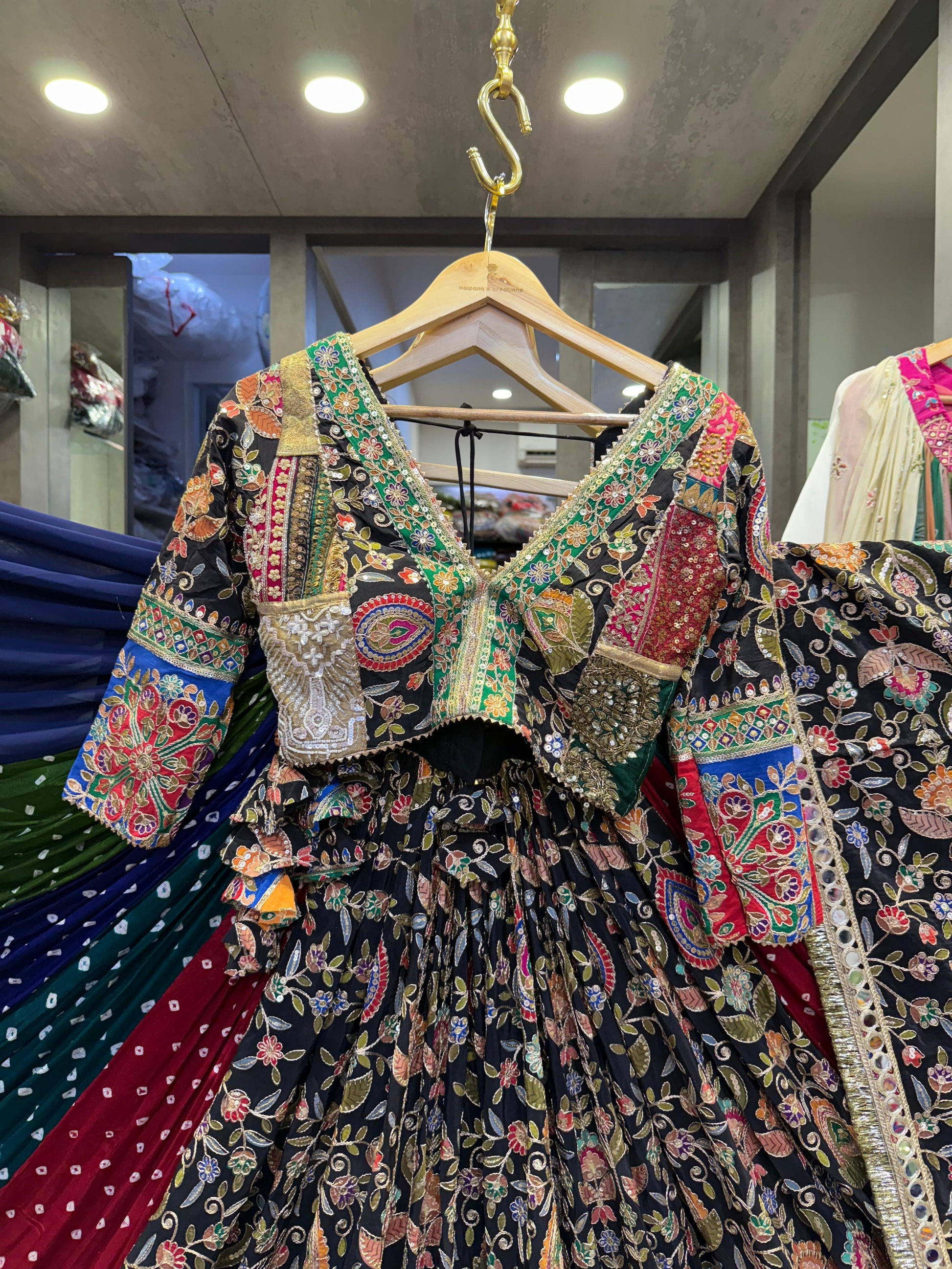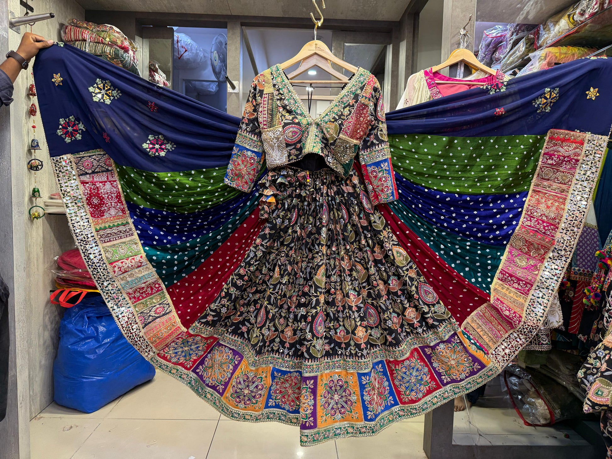 Crafted using luxurious gaji bandhni panels with flowing georgette multi-kalis, this chaniya brings drama, depth, and authenticity. The 22-meter flair is its crowning glory—ideal for those who want their twirls to mesmerize during Garba nights or cultural celebrations. Enhanced with hand-placed mirror work and heritage lace finishes, it’s a canvas of artistry.