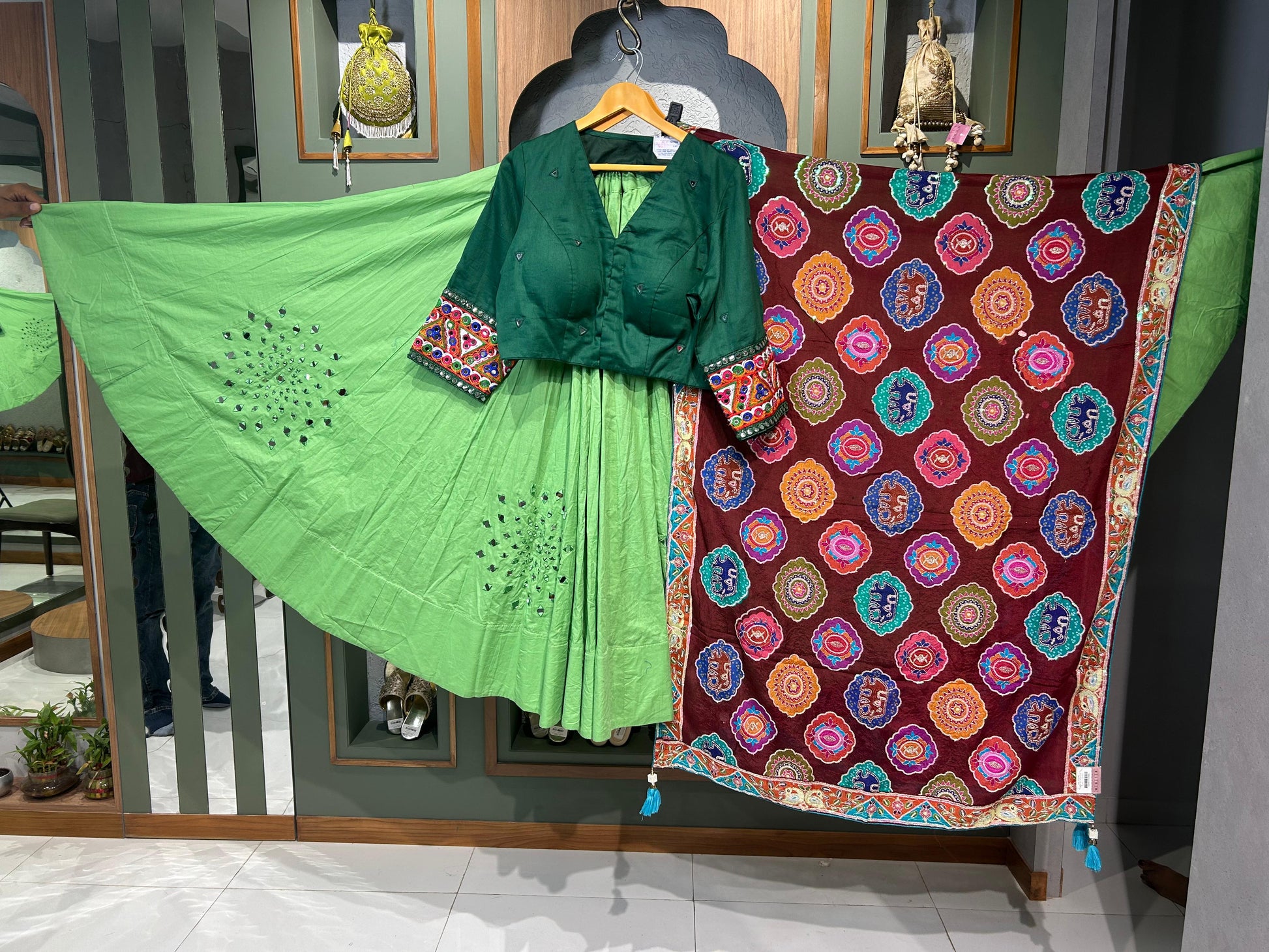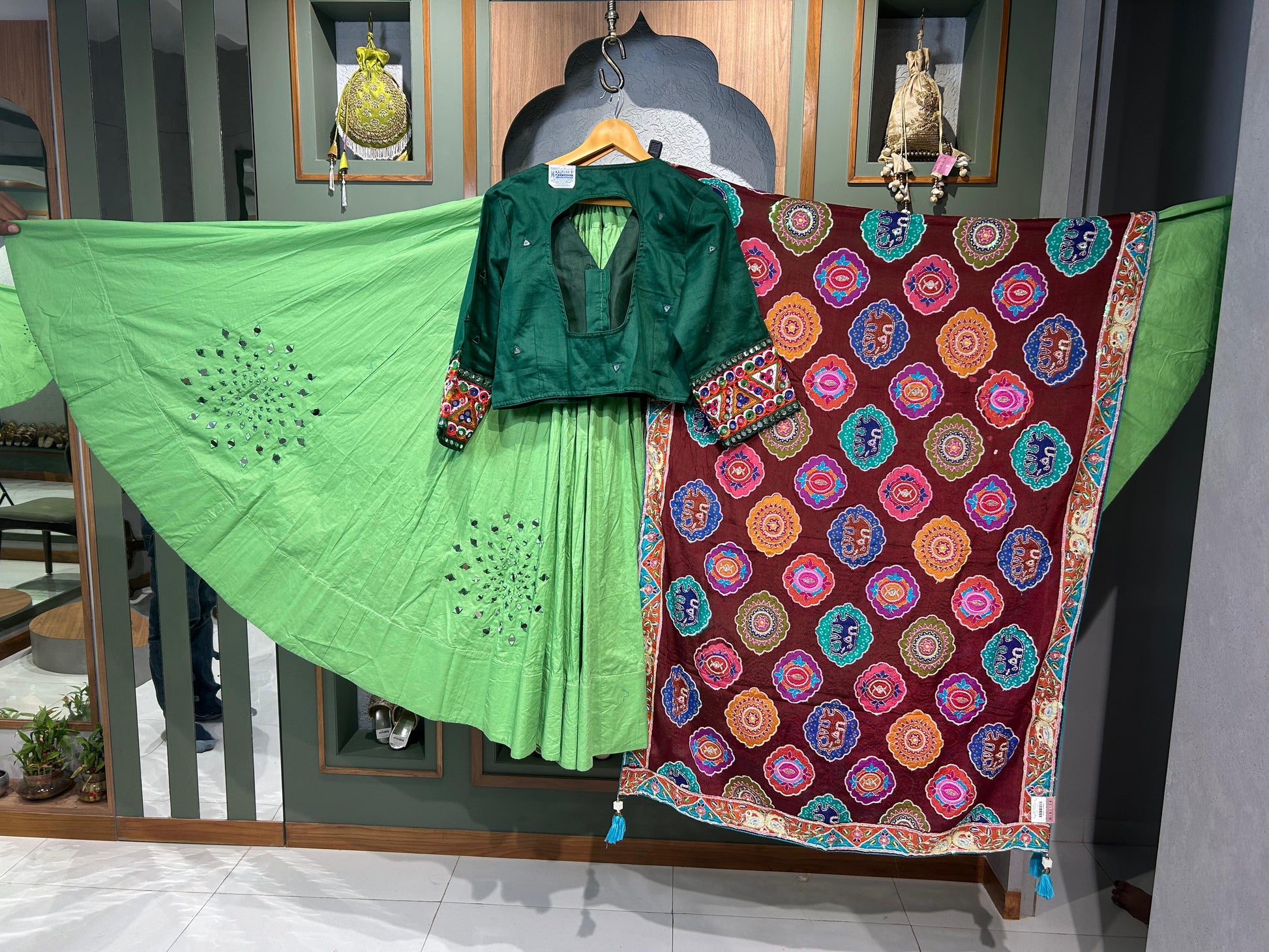 The eye-catching lime green chaniya is crafted with mirror work embellishments, artistically arranged in floral-inspired circular motifs. Made with soft, flowy fabric, it offers a grand flair of 10 to 12 meters, ensuring every twirl is as magical as it is dramatic. -