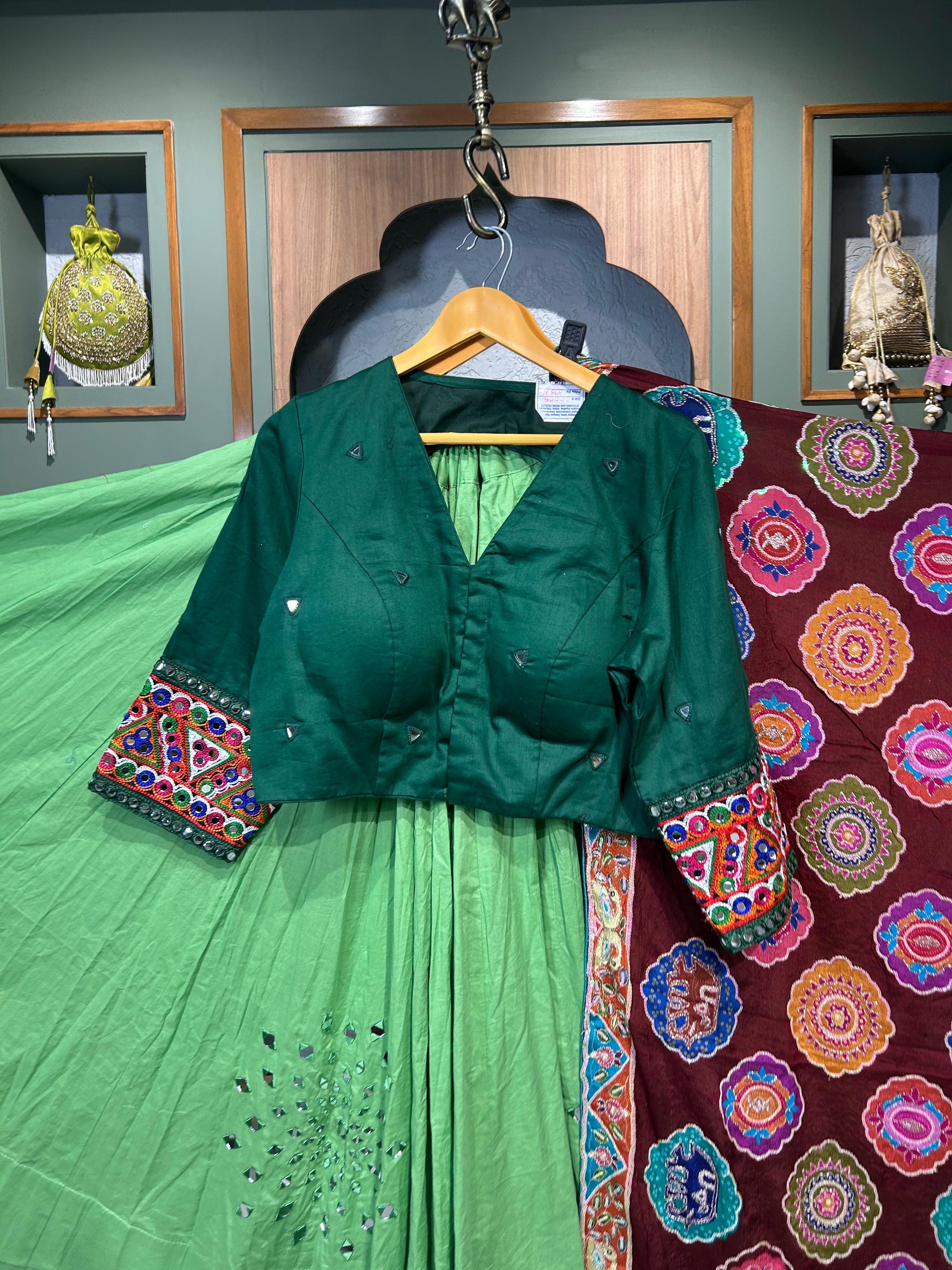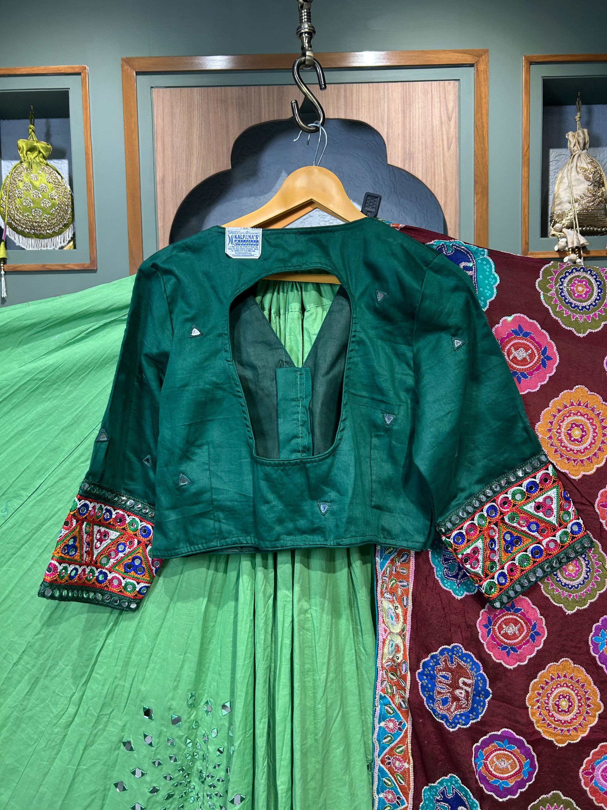 The blouse features authentic Katchi embroidery on the sleeves, showcasing vibrant mirror and threadwork in traditional patterns. The deep emerald green base offers a striking contrast to the lehenga, and its structured silhouette adds elegance and charm. -