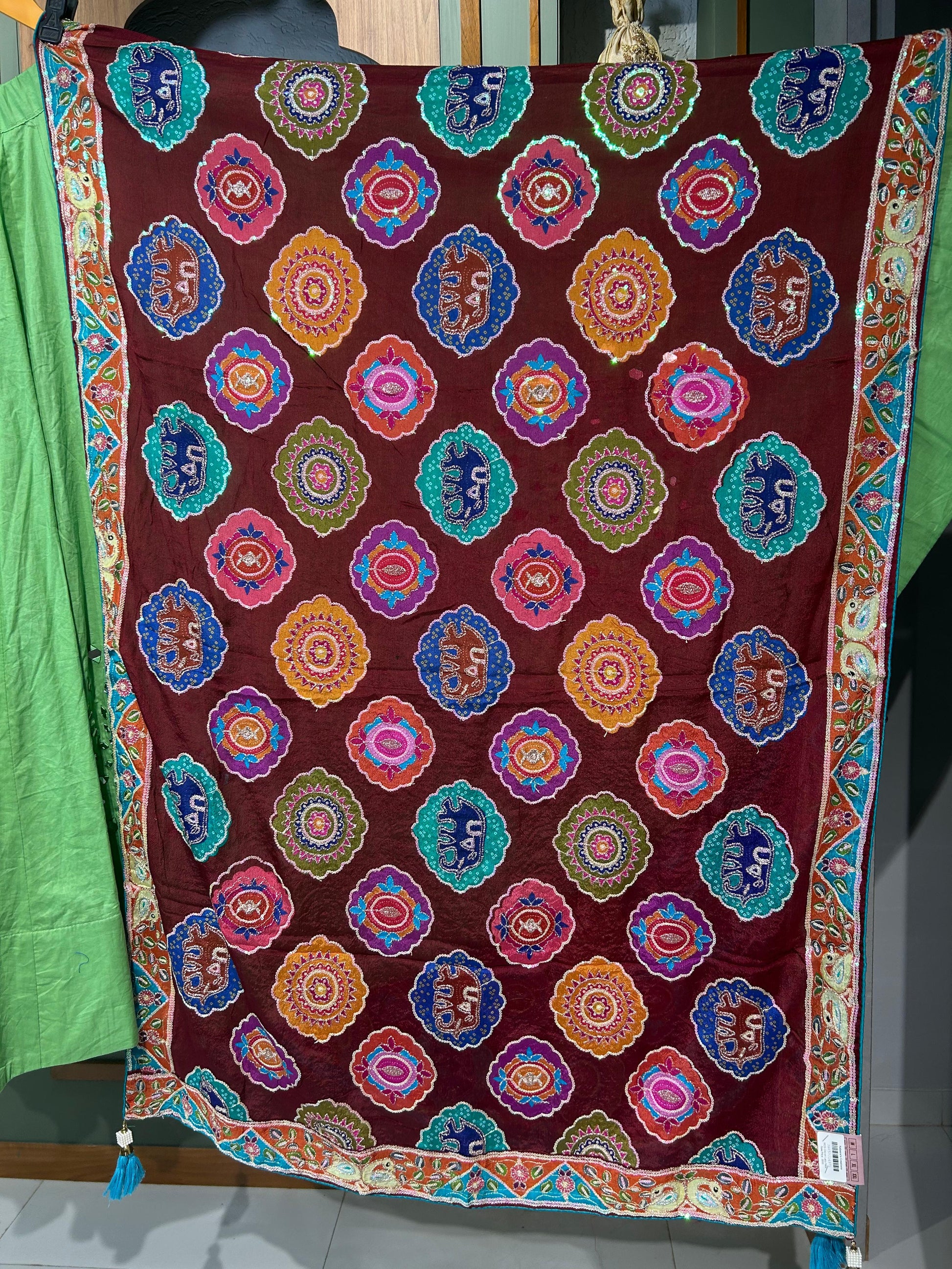 The vintage dupatta is a rich maroon base adorned with colorful mandala-like motifs and traditional symbols, bordered with intricate mirror work and embroidered edges. It ties the entire outfit together with heritage richness and visual depth.