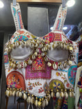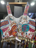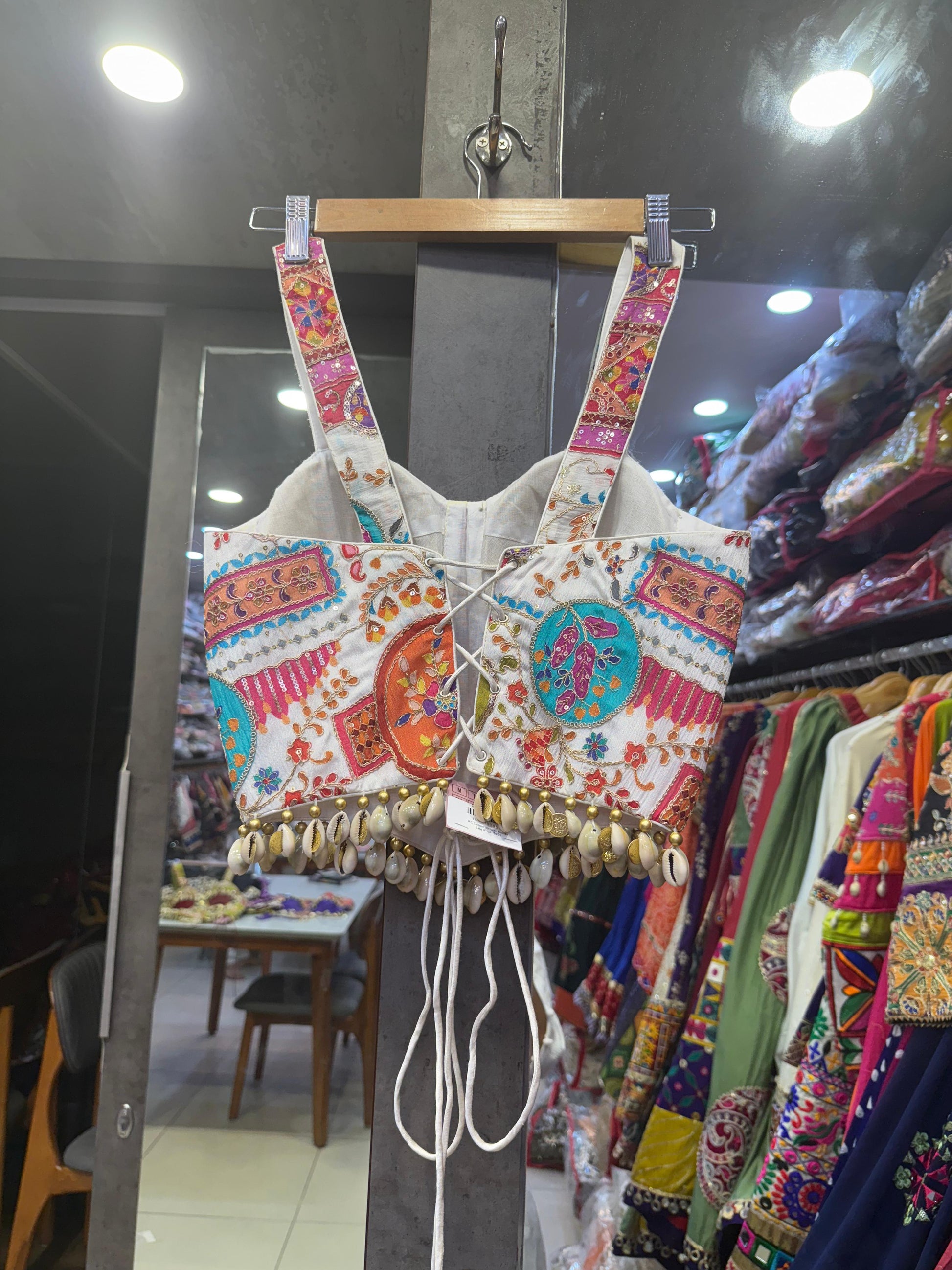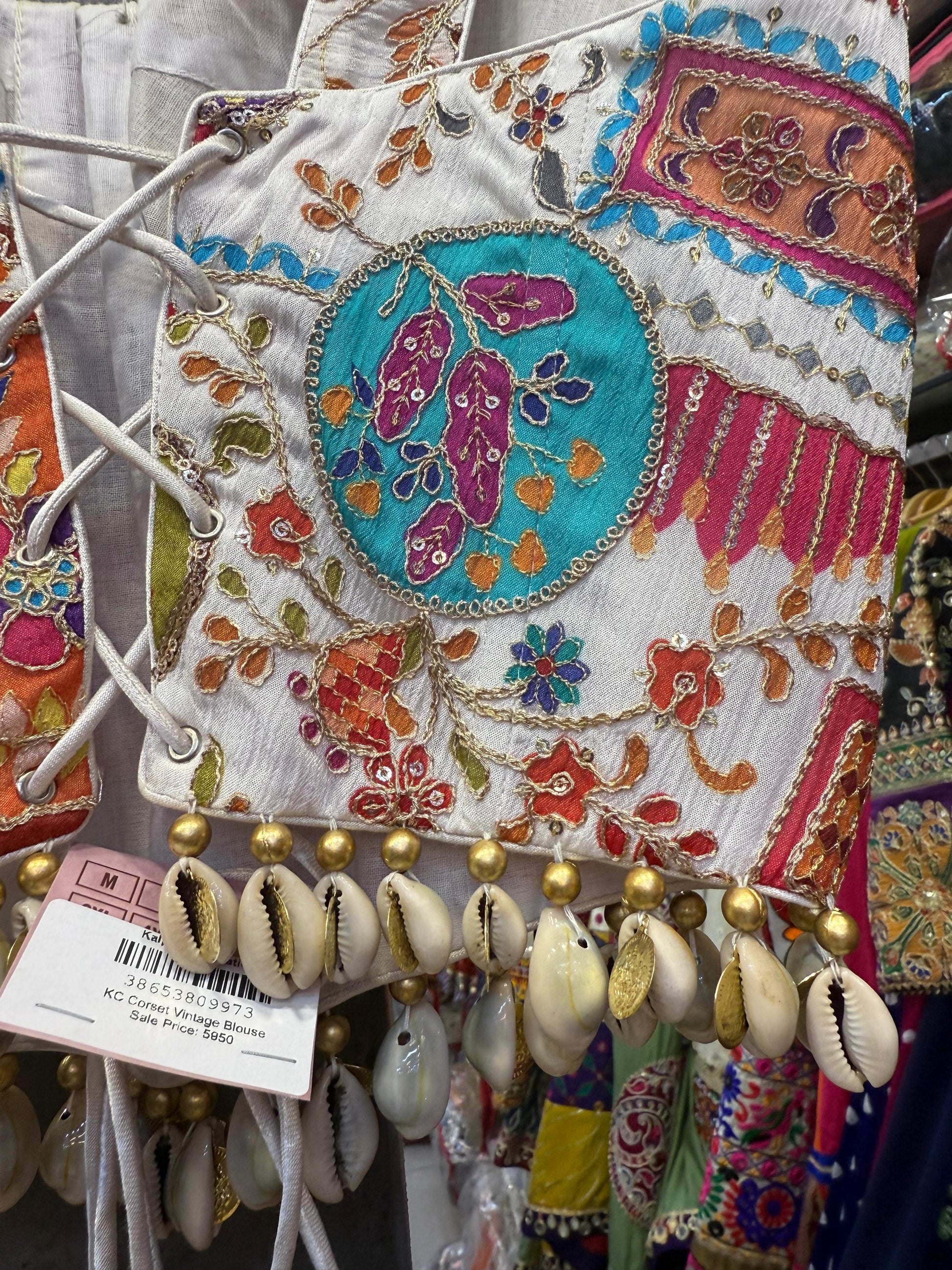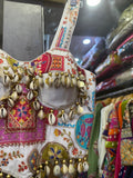 Introducing a stunning blend of tradition and boho-chic — this handworked vintage choli is crafted to captivate. Set on a rich white base, it features vibrant multicolor codi patches and intricate embroidery, each one thoughtfully placed to reflect the charm of traditional Indian craftsmanship.