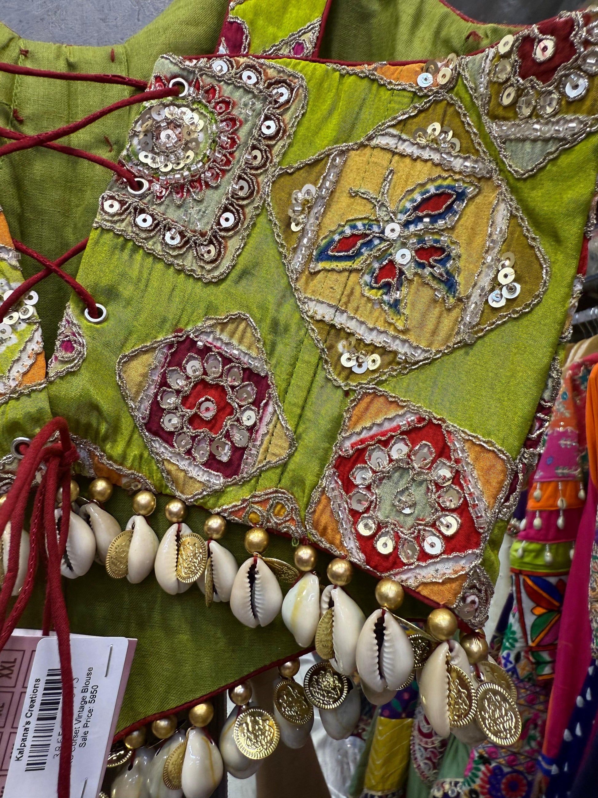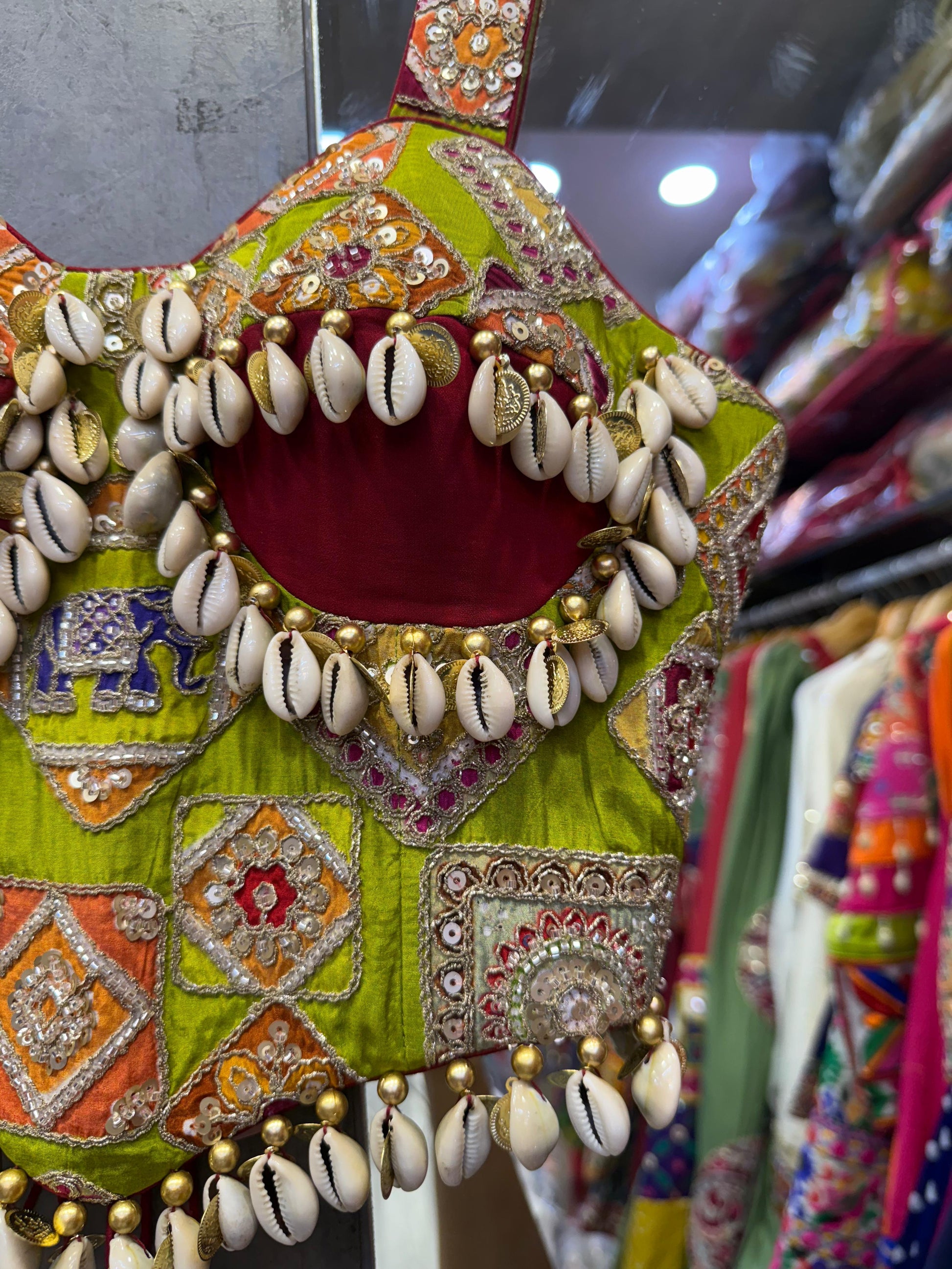 Celebrate heritage fashion with a bold and vibrant twist in this exquisite handcrafted choli, brought to life with authentic vintage codiwork patches and intricate embroidery. The fresh lime green base is contrasted beautifully with deep maroon cup detailing, making it a stunning fusion of earthy and rich tones.