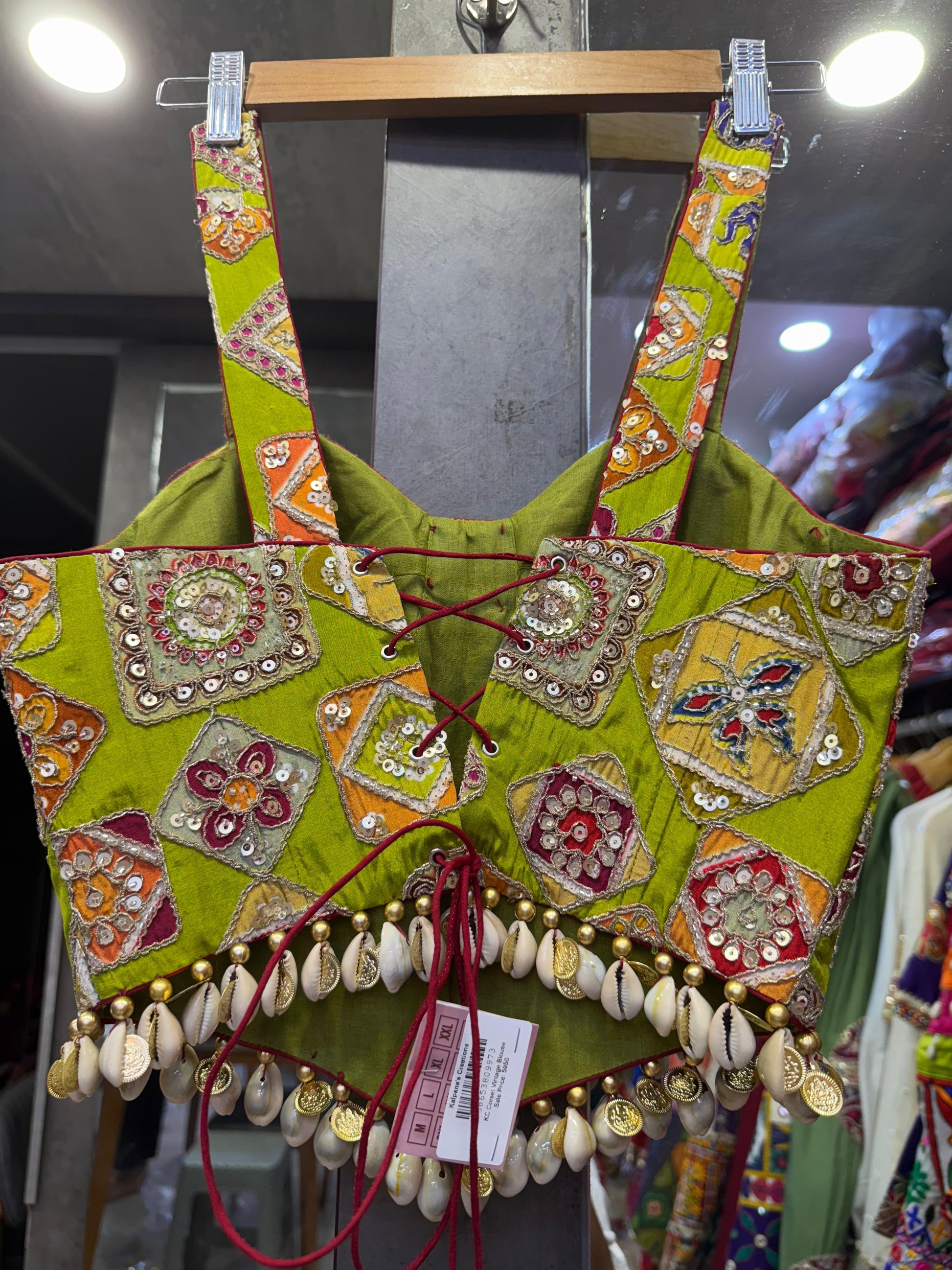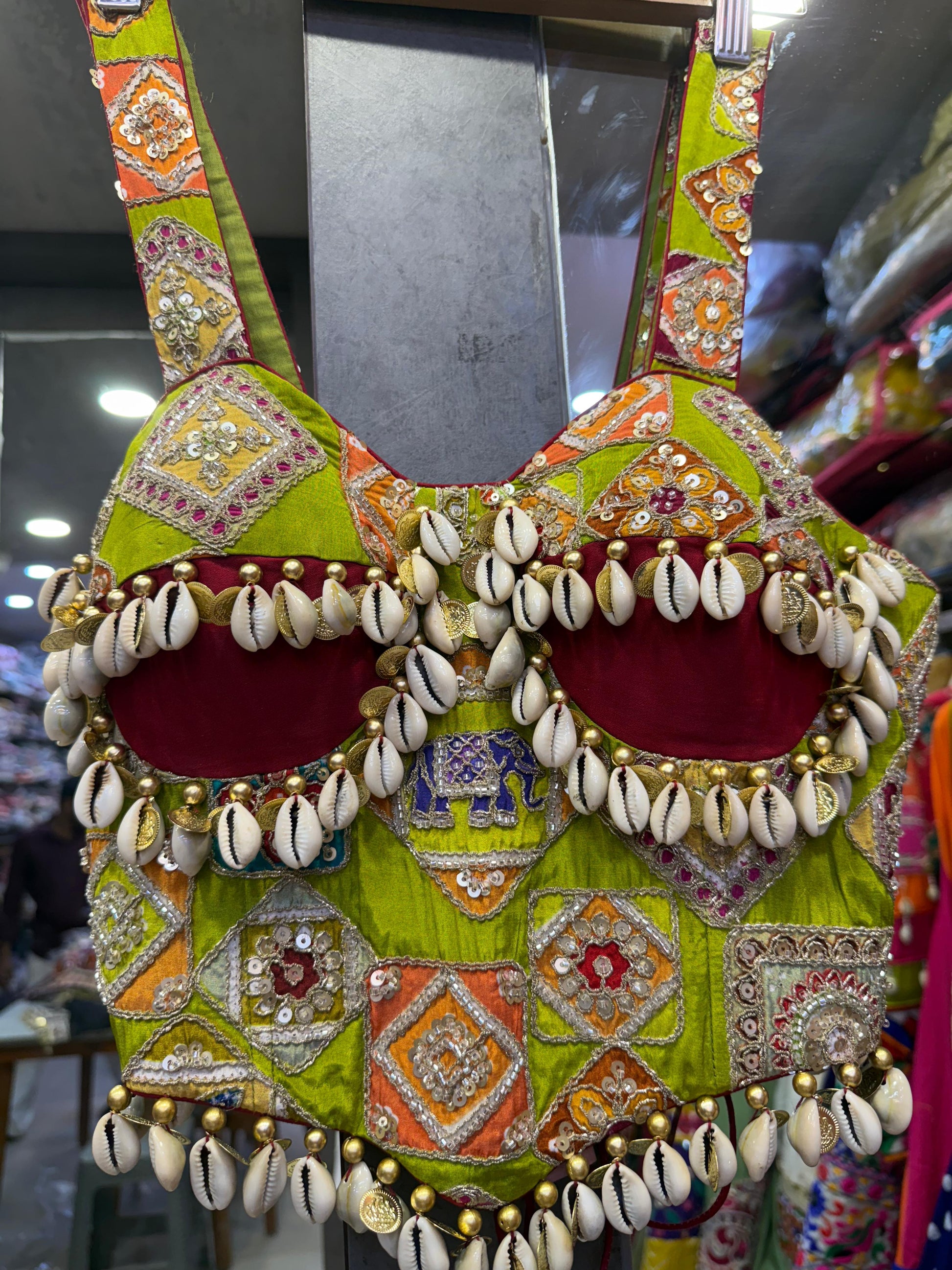 The choli is adorned with hand-stitched cowrie shells and antique coin hangings, which sway gracefully with every step, adding rhythmic movement and festive charm to your look. These elements not only enhance its visual appeal but also honor the essence of traditional tribal and folkwear from Gujarat.