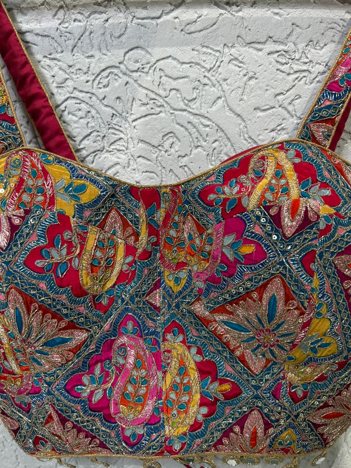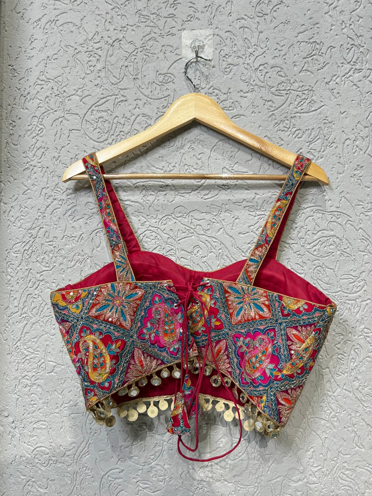 Its minimalist silhouette paired with rich textures and intricate patterns makes it perfect to style with Chaniyas, lehengas, or even Indo-Western bottoms. Whether it’s a festive gathering or a fusion event, this blouse effortlessly elevates your ensemble.