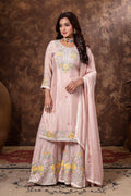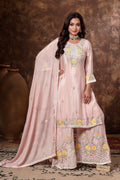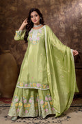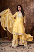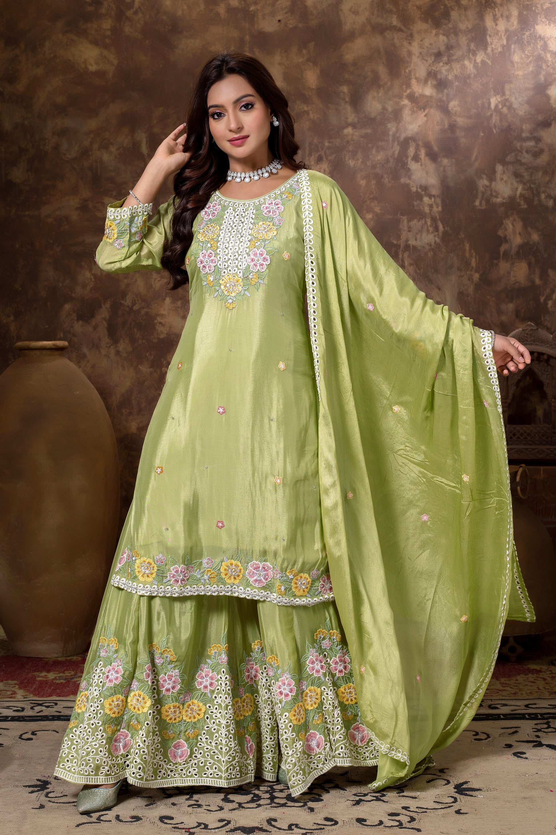 Adorning the outfit is delicate floral machine embroidery, meticulously crafted to bring subtle texture and feminine charm. The floral motifs add elegance without overpowering the design, creating a refined and aesthetically pleasing look.