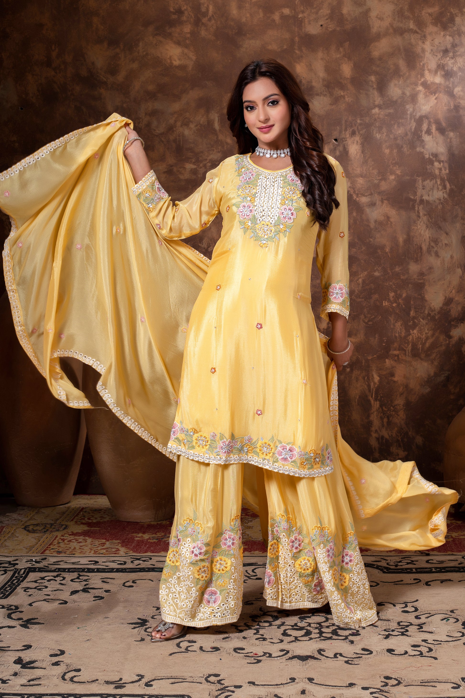 Designer Modal Fabric Ensemble with Floral Machine Work & Georgette Dupatta
