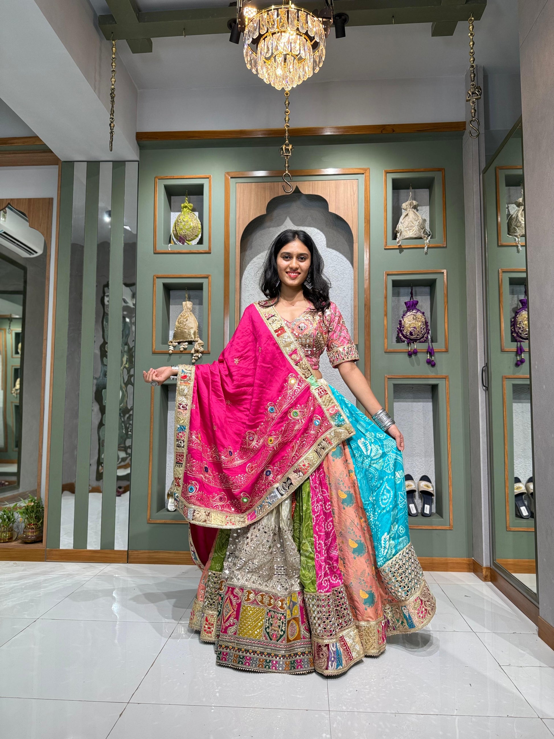 Make an unforgettable entrance in “Royal Riwaayat”, a couture-level chaniya choli ensemble crafted for the modern diva who loves heritage with a bold twist. This full flair chaniya is a multi-Kali marvel — seamlessly combining rich tissue fabric, vintage bandhani, mirror detailing, and painstaking hand embroidery. The blouse is adorned with traditional craftsmanship, while the dupatta carries an old-world soul that ties the ensemble together.