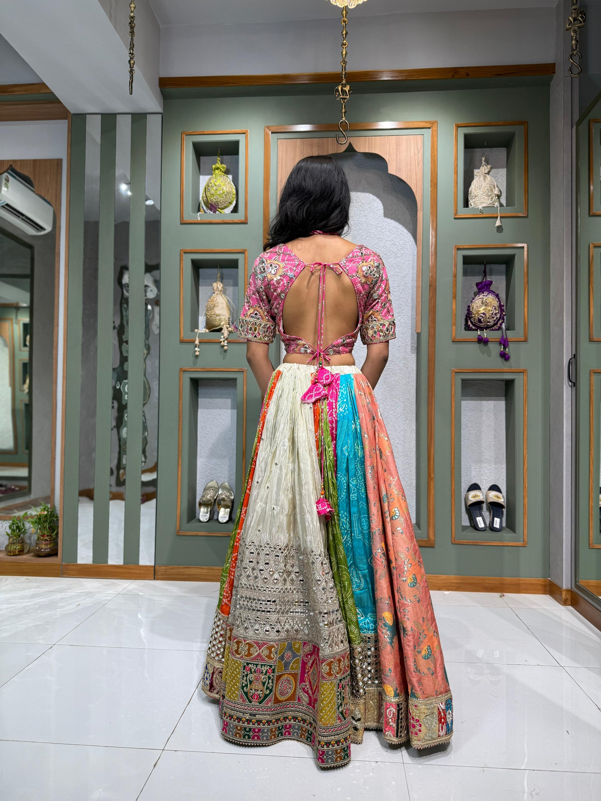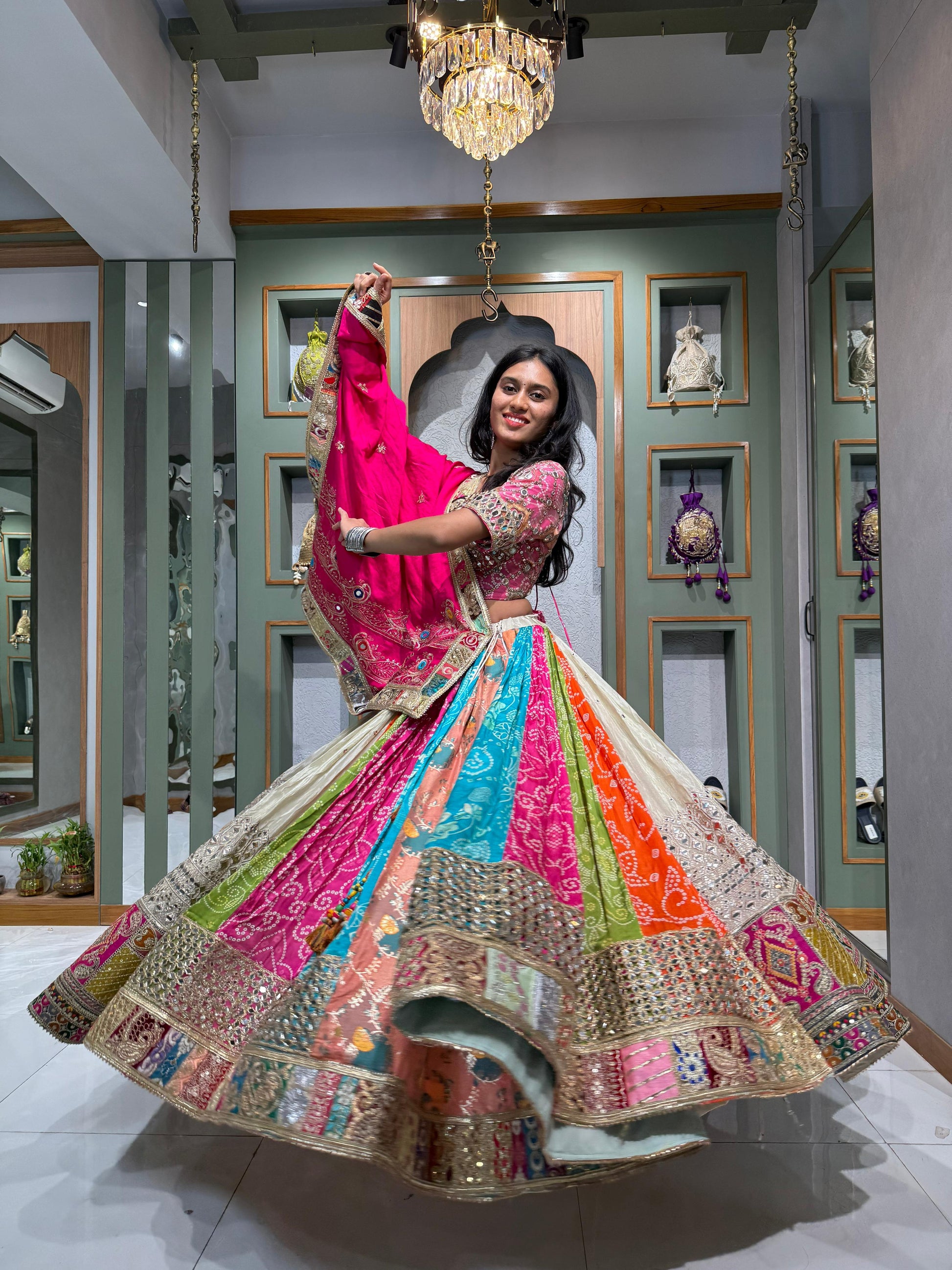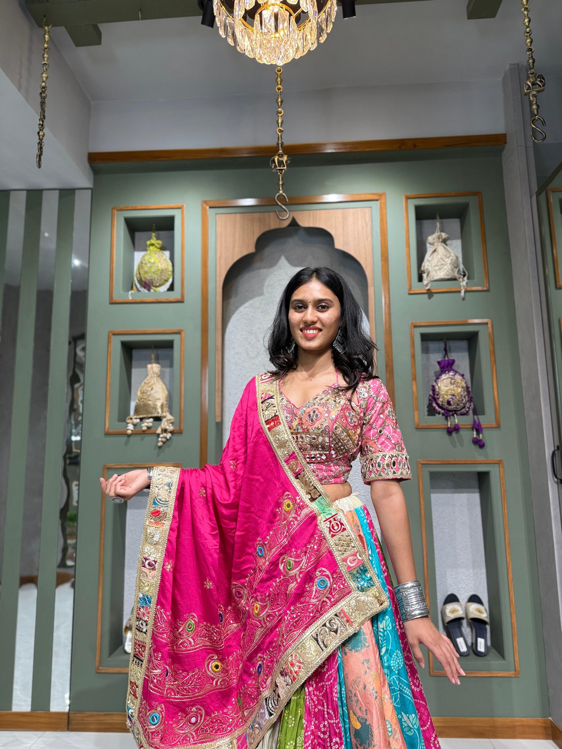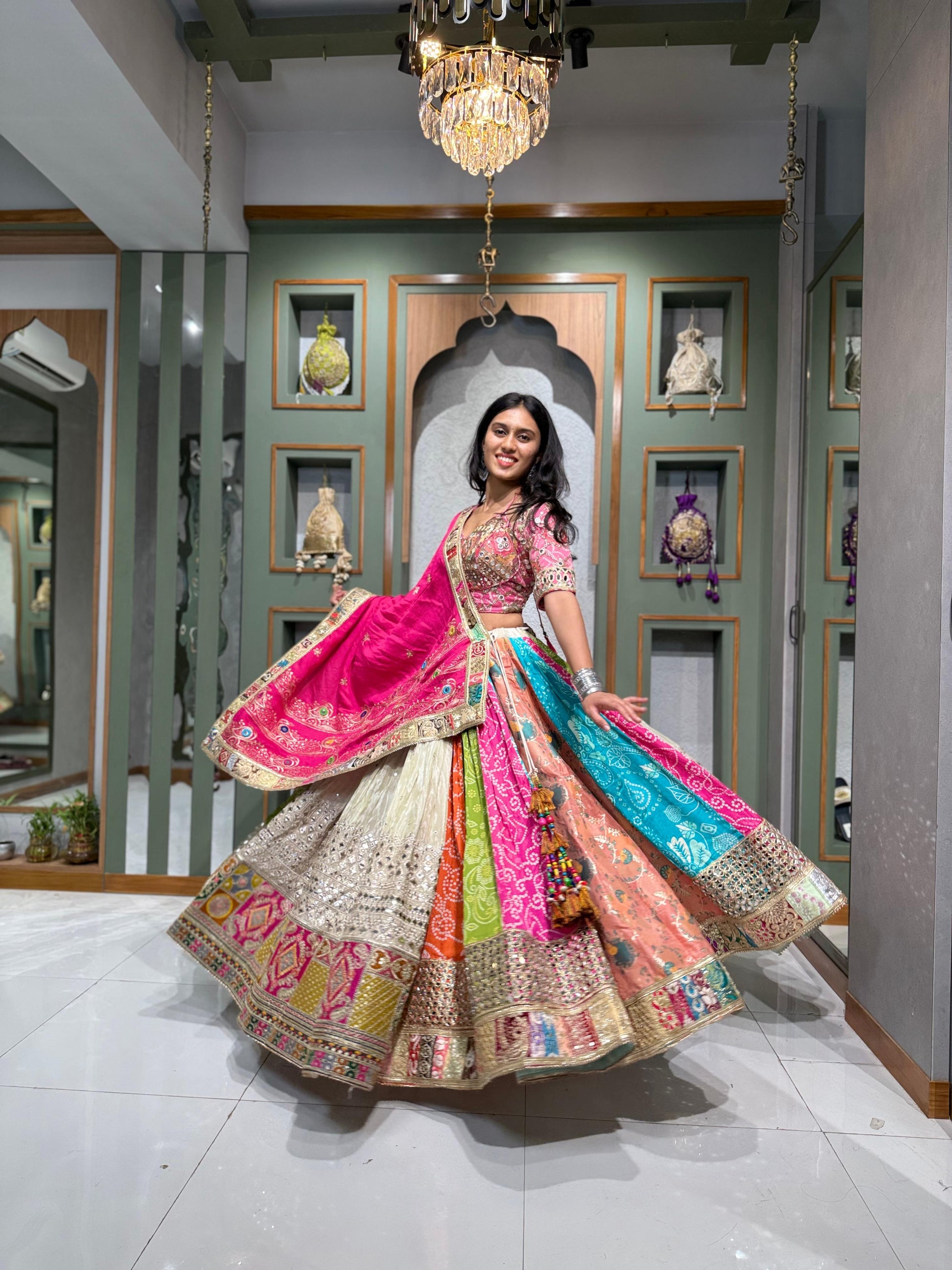 Each kali in the chaniya is a brushstroke of cultural artistry — a stunning combination of bandhani, tissue, and mirror work, resulting in a skirt that’s not only wide and flowing, but tells a story with every twirl. The vibrant vintage charm and royal silhouette make it a one-of-a-kind heirloom piece.