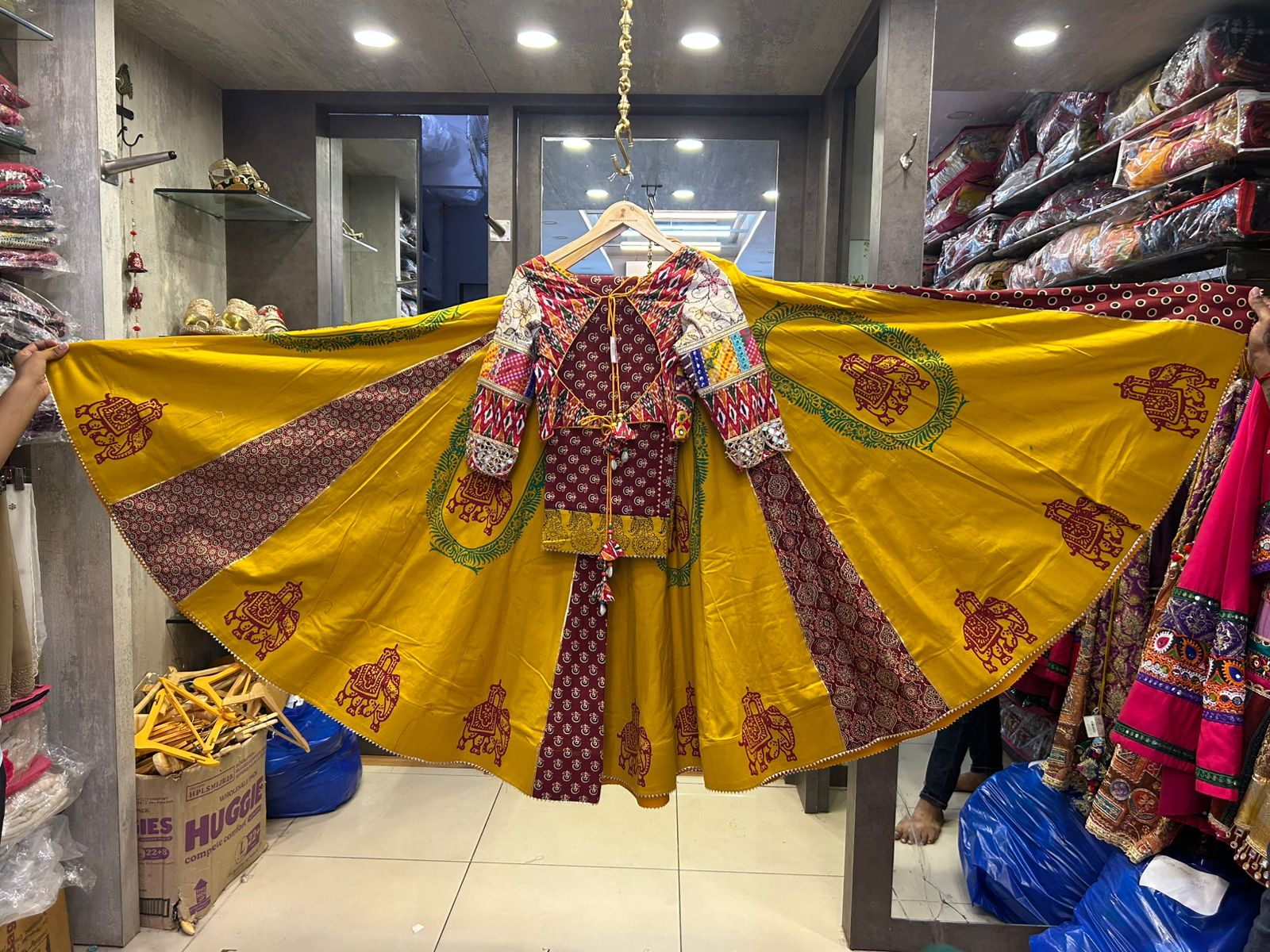 Crafted from pure cotton, the chaniya is adorned with timeless hand block prints — each motif a testament to traditional craftsmanship. The voluminous 12-meter flair ensures a regal, twirl-worthy presence, ideal for Garba nights, haldi ceremonies, or intimate festive gatherings.