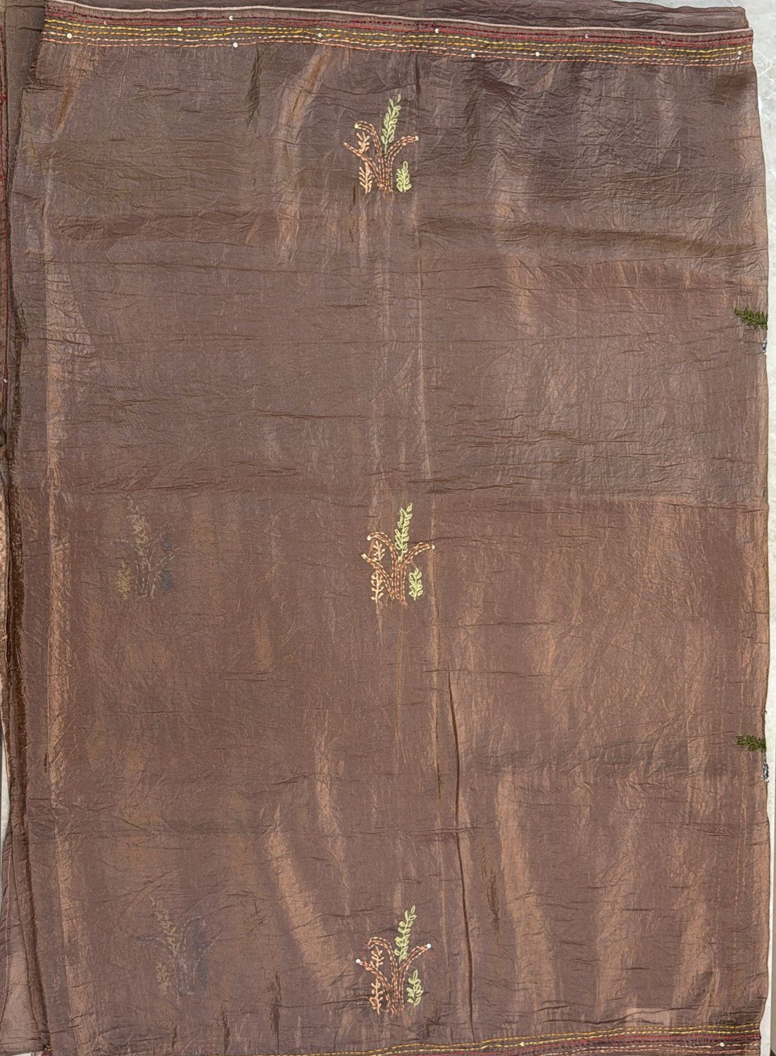 • Authentic Kantha–Rabari fusion handwork on pure Tussar silk