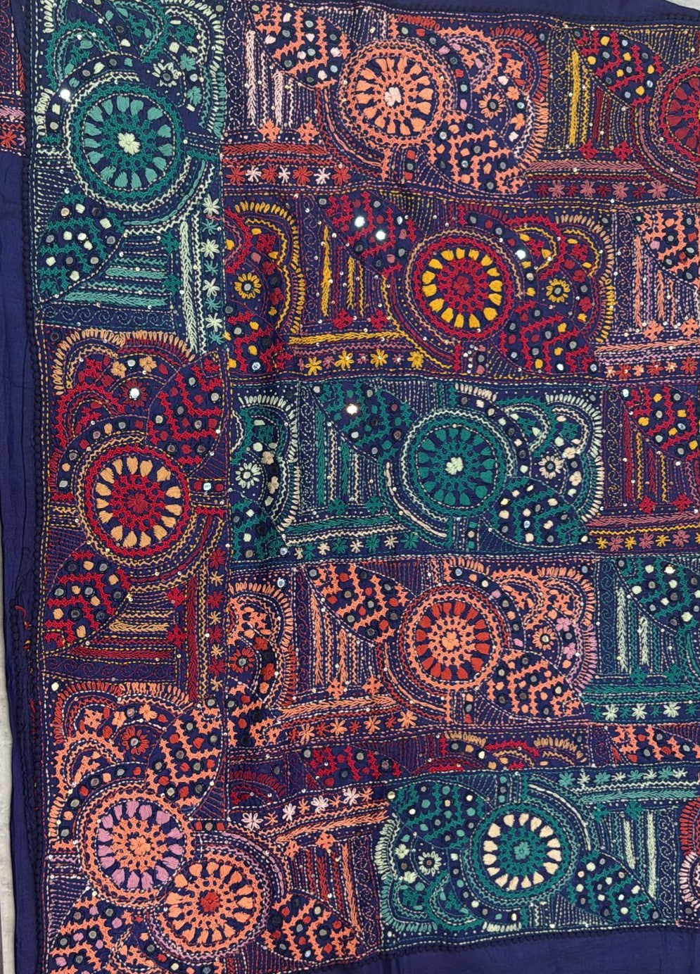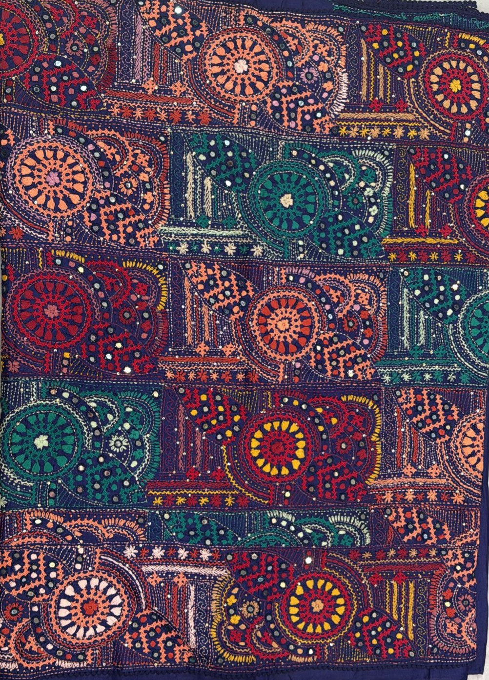• Kantha–Rabari fusion handwork on semi Tussar silk