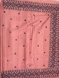 The highlight of this saree is the exquisite Kantha–Rabari fusion work crafted on semi Tussar silk, showcasing a beautiful blend of traditional hand embroidery techniques. This fusion reflects artisanal storytelling through intricate patterns, adding depth, character, and cultural richness to the saree while maintaining a sophisticated aesthetic.