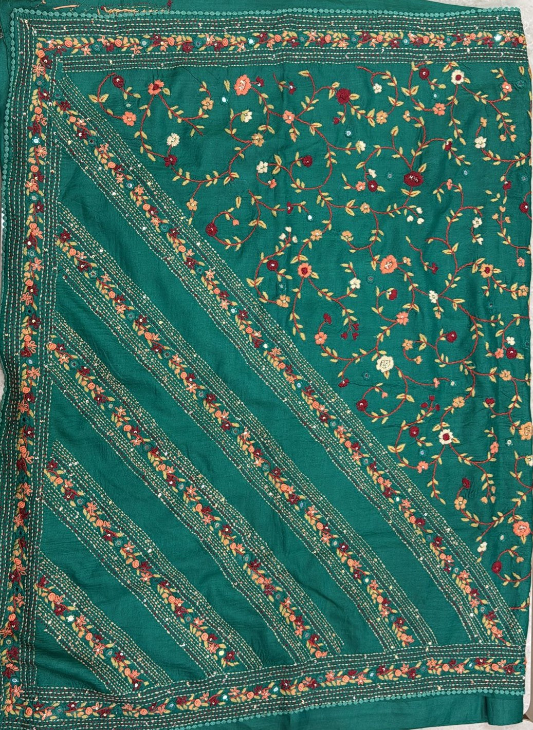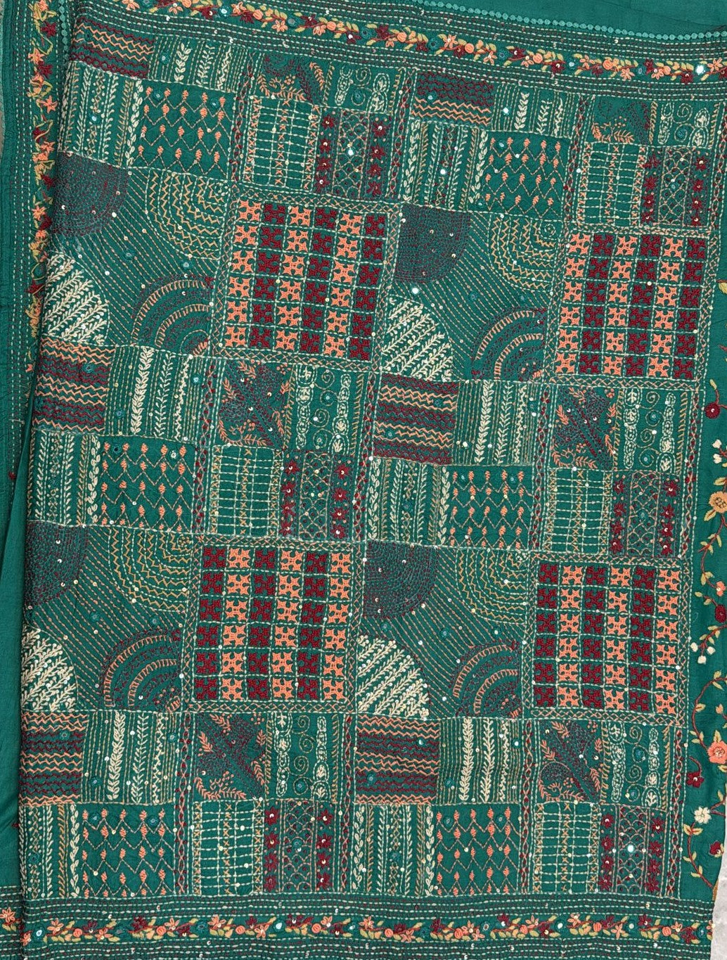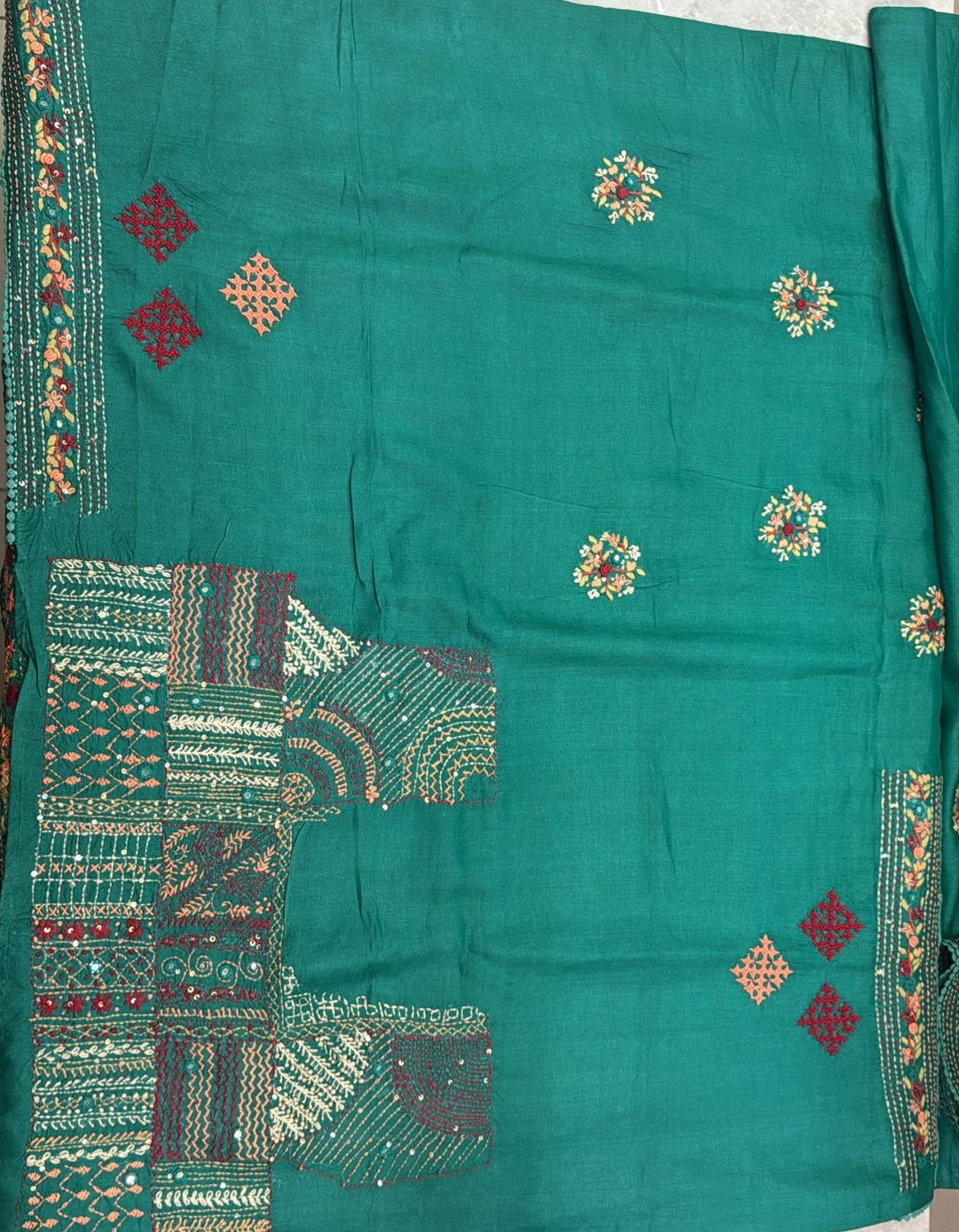 • Kantha–Rabari fusion handwork on semi Tussar silk