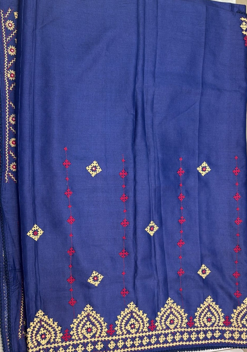 • Kantha–Rabari fusion handwork on semi Tussar silk