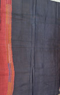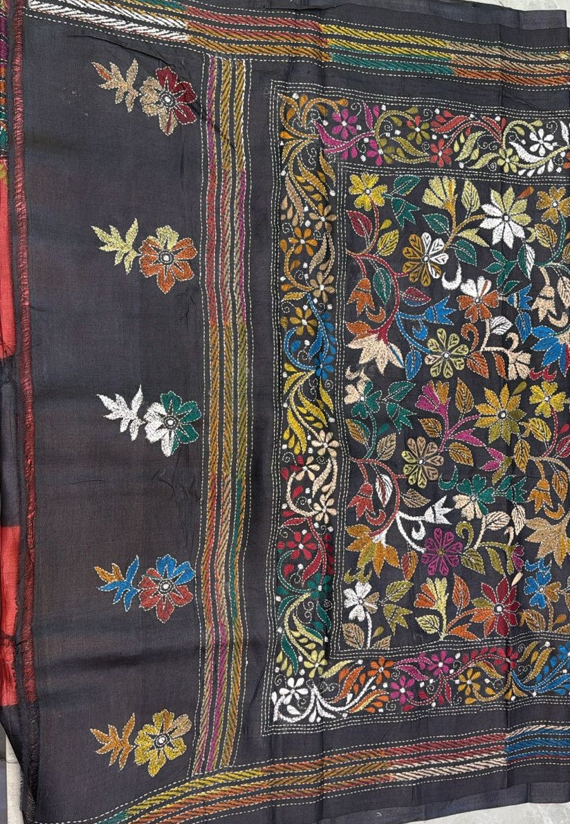 The highlight of this saree is the exquisite Kantha–Rabari fusion work crafted on semi Tussar silk, showcasing a beautiful blend of traditional hand embroidery techniques. This fusion reflects artisanal storytelling through intricate patterns, adding depth, character, and cultural richness to the saree while maintaining a sophisticated aesthetic.