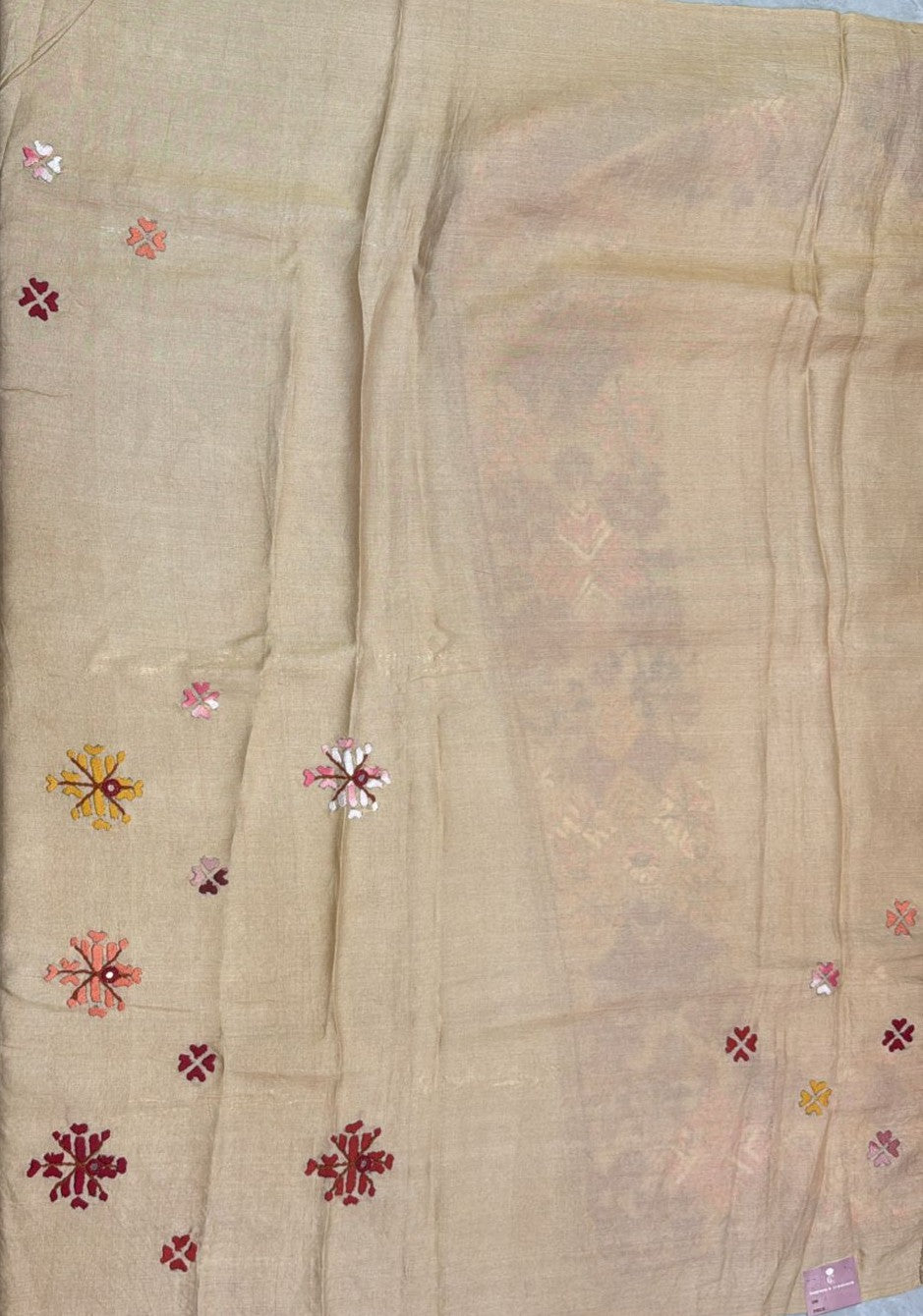 The highlight of this saree is the exquisite Kantha–Rabari fusion work crafted on semi Tussar silk, showcasing a beautiful blend of traditional hand embroidery techniques. This fusion reflects artisanal storytelling through intricate patterns, adding depth, character, and cultural richness to the saree while maintaining a sophisticated aesthetic.