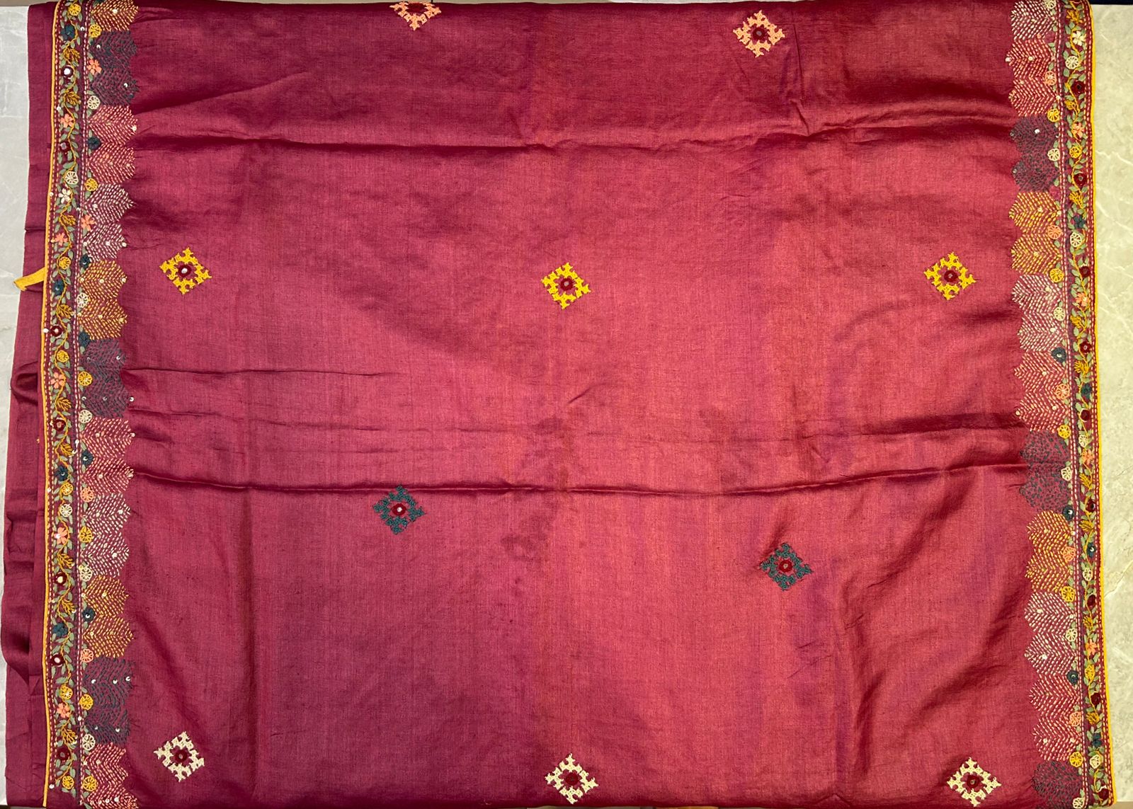 Kalpana’s Creations unveils a DESIGNER Katha Work Saree — a timeless blend of tradition and contemporary elegance, crafted in pure Tussar silk. This exquisite 5.5-meter saree, paired with a 0.9 to 1-meter blouse piece, embodies a modern chic look for the woman who values artistry and sophistication.
