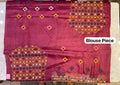 The saree features intricate Katha (Kantha) embroidery, telling stories through every delicate stitch. This detailed handwork creates a unique texture and pattern, showcasing the beauty of Indian craftsmanship with a modern flair.